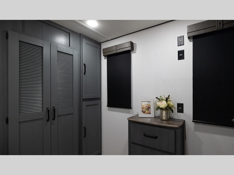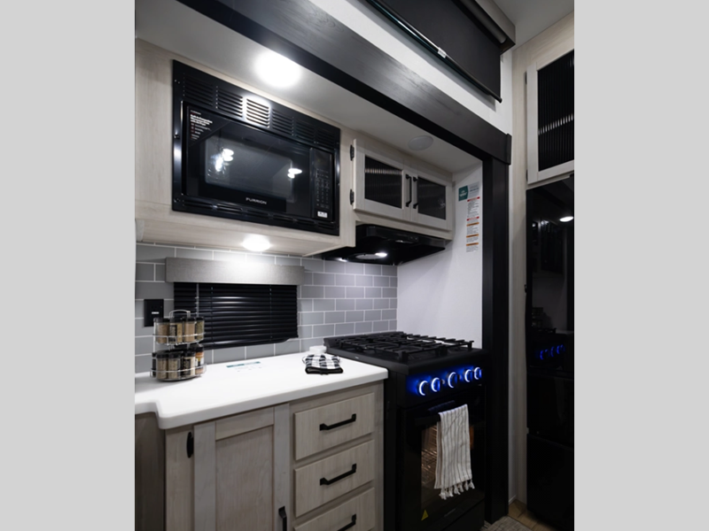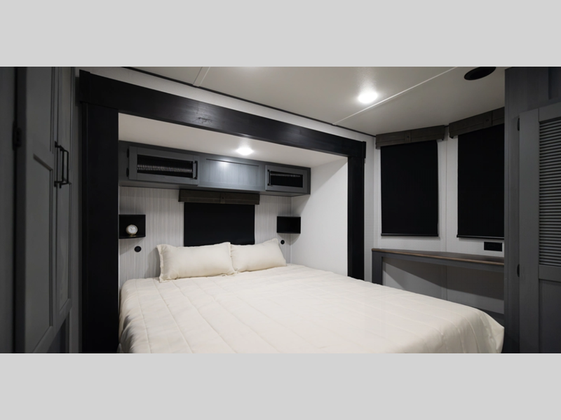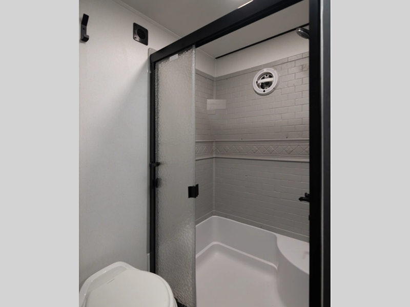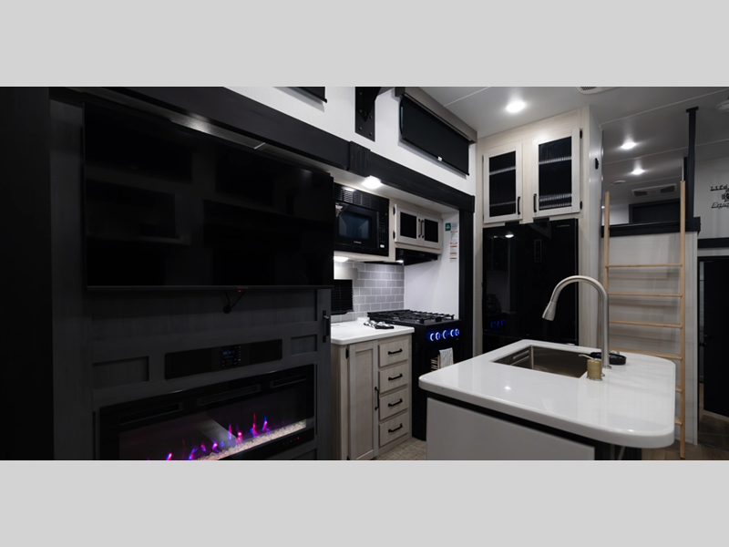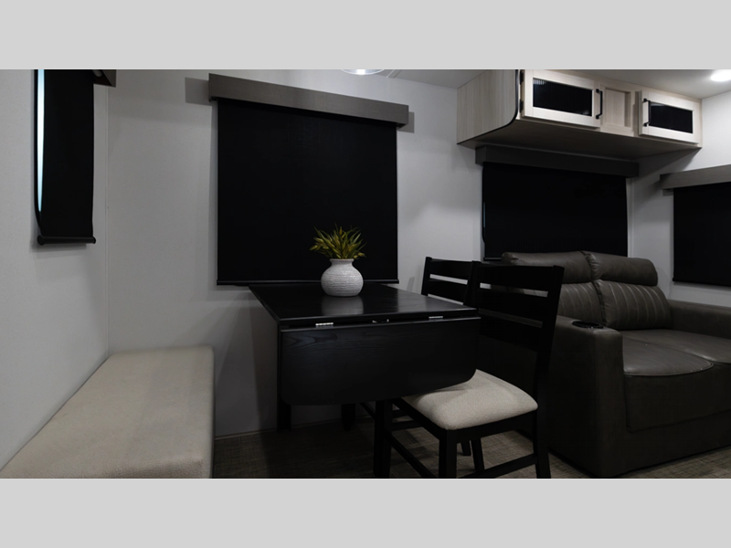 The Congoleum flooring inside is not only eye-catching, but also resilient and durable to withstand your adventurous lifestyle. There is a tankless water heater for added comfort, along with night roller shades, a residential-style refrigerator, and solid surface countertops.